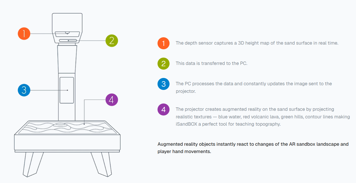 iSandBox is an interactive augmented reality sandbox that uses real sand combined with a depth camera, high-precision projector, and UTS’s proprietary AR engine. The system analyzes changes in the sand’s shape and instantly projects dynamic visuals onto the surface.